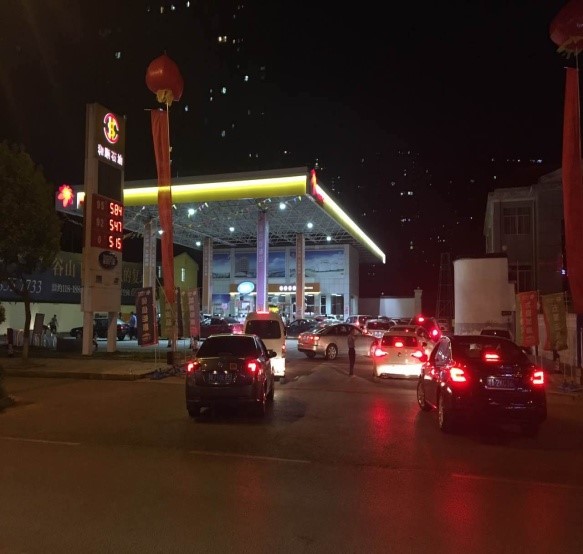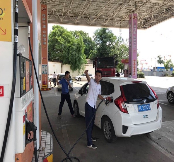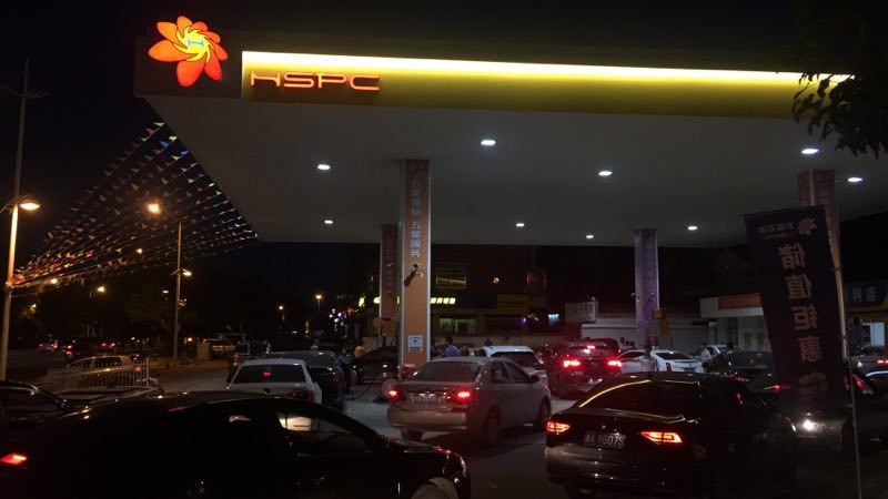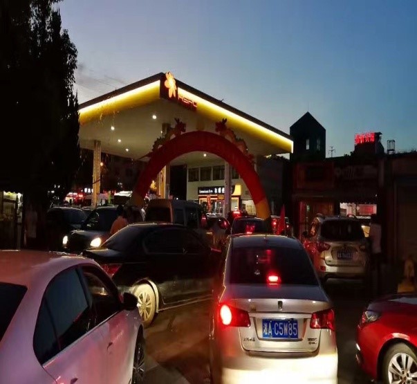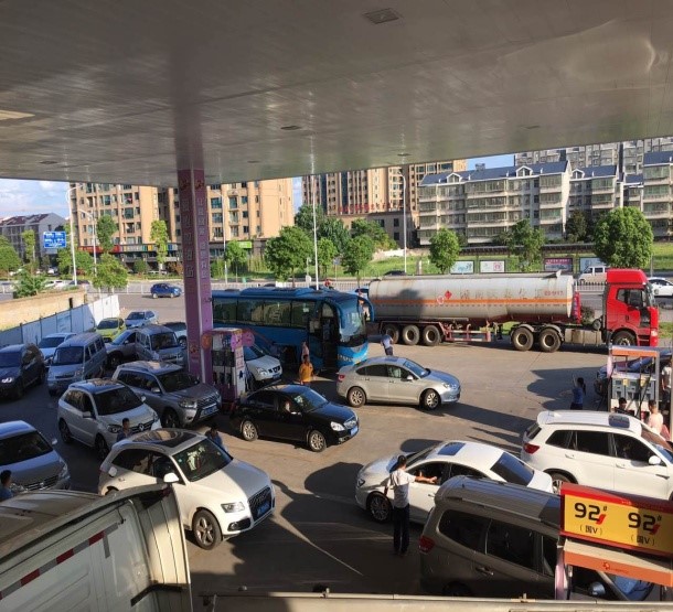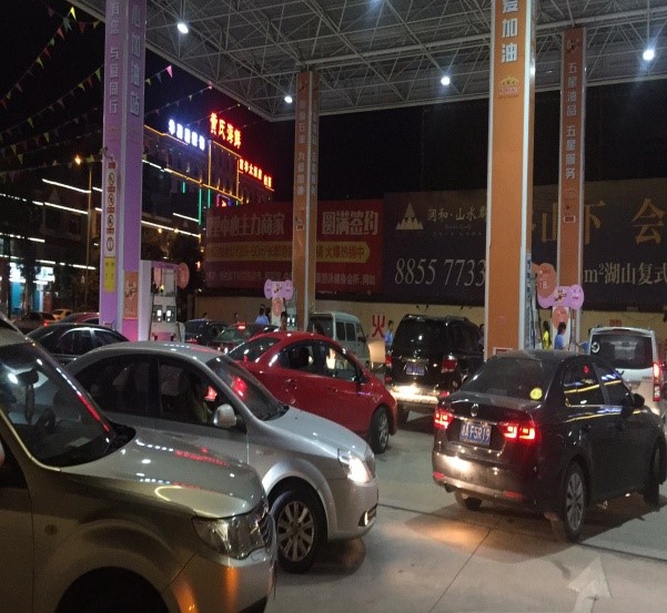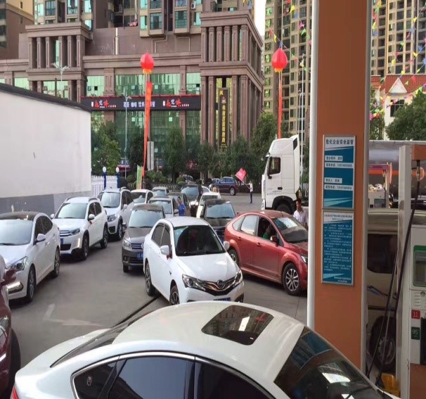 7月18日,蓝天如洗,加油站内彩旗飘飘,从上午7:00开始,各加油站便进入了忙碌不停的状态,一整天车辆川流不息,络绎不绝。